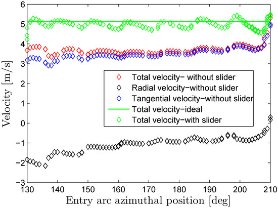 Comparison of runner entry velocities with and without the slider at Q = 40 lps, H = 1.337 m, = 199 RPM, and .
