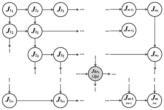 The problem addressed in this paper is a mixed-flow shop scheduling problem with NPE and TF objectives. In this scenario, jobs are to be processed on machines in sequence and a job contains a batch of the same workpieces. Each job has an established process route . is equal to in number and all the jobs flow according to the ascending machine numbers. denotes the processing time of on . Each job has a release time and a due date . In manufacturing, a feasible job sequence = will be arranged on , where is the -th job processed on and is the total number of jobs using . In addition, the jobs in have a one-to-one relationship with those jobs to be processed on . An example of the directed graph of a mixed-flow shop is illustrated in Figure 1. The idle time and NPE vary along with the scheduling approaches for the jobs’ processing time. Therefore, the key issue is to find the job permutation strategy for each machine that minimises the NPE as well as TF.