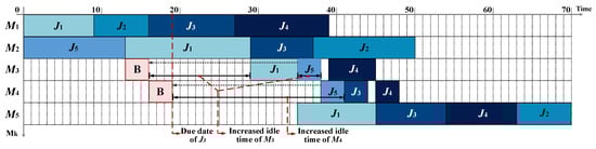 NPE is the integration of the machines’ idle power in their idle time, respectively. To reduce the NPE, an optimal job sequence can be adopted, and this planned schedule should ensure the due dates of all jobs. However, the relationship between minimising NPE and ensuring the due date is not positive. In other words, a conflict exists between them. The following scheduling situation is taken as an example (see Figure 2). When on and is arranged to B, the other jobs’ arrangements are not affected. The TF of other jobs and the NPE of , , and are unchanged while the replaced job’s TF decreases and the NPE values of and increase. As a result, the total TF decreases and the NPE rises.