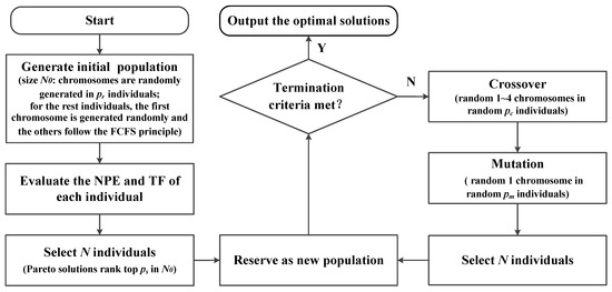 First, the chromosome’s coding method and fitness function should be given. In the MCEA, a gene, a chromosome, and an individual represent a certain job, a job sequence, and a scheduling scheme , respectively. Second, the initial population with individuals is generated. Two principals are applied in generating the initial population: one is that all the chromosomes in individuals are generated randomly; the other one is that the first chromosome in the individual is randomly generated and the other chromosomes follows; first come first served. The of the individuals are generated by the first principal and the rest are generated by the second one. The initial population is selected by the fitness function, where fitness 1 = and fitness 2 = . Then individuals whose Pareto solutions rank the top in as a new population are reserved. Third, the children population is produced by crossovers and mutations: (1) Crossover: exchanging a random 1–4 chromosomes between two individuals. The crossover rate is . (2) Mutation: modifying 1 random chromosome in the individuals. The mutation rate is . Fourth, the next generation is selected from the combination of the individual parent and children by evaluating the fitness function. Once the iteration achieves G, the process ceases and outputs the non-dominant optimal solutions. If the termination criteria are not met, step four and step five repeat once more. In addition, all of the random selections are created by the roulette wheel approach.