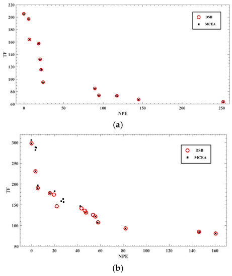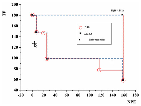 The results of DSB and MECA in the two cases are shown in Figure 5. To assess the solution quality of MCEA, the hypervolume indicator is applied [34,35]. The maximum value of the NPE and TF in the results is taken as the reference point’s horizontal and vertical coordinates, respectively [36]. The results of one test in 4 jobs × 5 machines is reflected in Figure 6 and the point R is the reference point. The area enclosed in red straight lines represents the dominated subspaces of solutions in DSB. The smaller area enclosed in blue dotted lines represents the dominated subspaces of the solutions in MCEA.