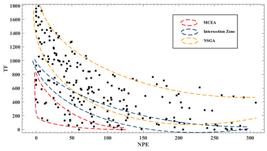 The non-dominated Sorting Genetic Algorithm (NSGA) and its related improved algorithms are widely applied in the multi-objective optimisation of workshop scheduling problems [37,38]. To assess the solutions’ quality of MCEA, the NSGA is compared in this study with the input of case 3. The results of the MCEA and NSGA after 10 independent runs are shown in Figure 8 and they are mainly distributed in the two zones enclosed within the red dotted lines and yellow dotted lines, respectively. The intersection zone contains the results of both algorithms, as enclosed with the blue dotted lines. The computation times of the MCEA and NSGA are approximates, ranging from 150 s to 200 s. The length of the computation time is mainly influenced by the parameters including the scale of the case, the iteration times, and the size of the population. As demonstrated in Figure 8, the results of MCEA dominate those of NSGA.