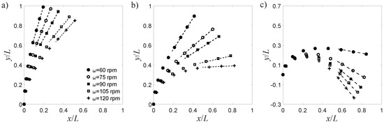 The various combinations of plate stiffness and rotational speeds defined in the previous section led to a variety of reconfigurations; namely, small deformations (Figure 2a), large deformations (Figure 2b) and extreme reconfiguration sets with deformations over 90 between the tangents of the plate tips. The dashed lines shown in the various plate reconfigurations indicate the section of the plates that underwent negligible deformation. Those sections were located around the top tip and resulted of the thick and medium plates, and of the thin plate, where s denotes the intrinsic coordinate along the structure. Interestingly, was primarily dependent on the plate stiffness and weakly on . Conversely, the location of the maximum deformation, , where curvature reaches a maximum, followed a trend , where is the Cauchy number, and is the second moment of the area (see Figure 3). This indicates that changes slightly at sufficiently large .