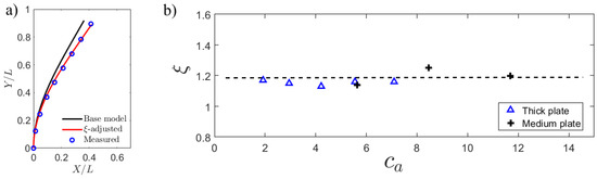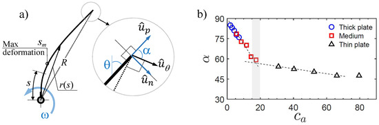 The estimation of reconfiguration patterns using basic models dealing with parallel incoming flow may be affected by the distinctive dynamics of these flows. However, application of such models may be applicable with a bulk correction. Indeed, let us consider a simple formulation based on the model by Chen [28]. Here, the local velocity at s along the plate (see Figure 4a) is given by: