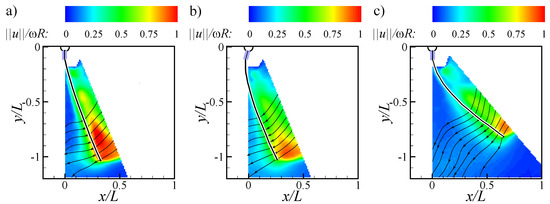 Phase-locked distributions of the velocity magnitude with superimposed streamlines in the vicinity of the thick plate at: (a) 60 rpm; (b) 90 rpm; and (c) 120 rpm.