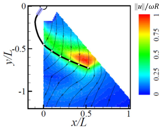 The induced wake exhibited interesting features that provide insight on the reconfiguration of the rotating plates. Figure 5 illustrates phase-locked velocity magnitude in the vicinity of the thick plate along its span for selected . Note that the velocity distributions near the plates are not proportional to the distance from the axis of rotation. Lateral shedding and some background turbulence from the previous cycle and plate reconfiguration may modulate the flow, where maximum level occurs near the tip; this effect is stressed with increasing . Note also the induced flow right upstream of the plates, which extended on the order of the plate width; i.e., consistent with flow impinging bluff bodies. In addition, Figure 5 shows the sharp shear layer at the tip of the thick plate, which lead to flow instability, namely Kelvin–Helmholtz type, and the formation of energetic tip-vortex structures illustrated later. The features of the flow near the plates is, in general, consistent in the other cases; for instance, Figure 6 shows the case of the medium plate at rpm. Although minor, Figure 5 and Figure 6 reveal a trace of the induced flow from the preceding plate near the upstream tip of the structures. Complementary insight is obtained with the time and spatial average of the velocity magnitude as a function of the distance from the axis of rotation (r), which is illustrated in Figure 7 for rpm. As expected, increased monotonically with r and reached the maximum near the tip, i.e., ; however, there is a distinctive difference with the thin plate. Indeed, the distributions of the medium and thick plates roughly resemble that of a canonic vortex profile; i.e., linear increase of the velocity for marking a solid-body-rotation-like state, which is followed by a fast decay of the velocity for , resembling an inviscid-like motion. This feature is not clear with the thin plate; the velocity decay in the external region was not sharp, possibly due to the induced flow by the large deformation.