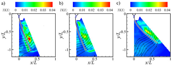 —averaged distributions of in-plane normalized turbulence kinetic energy of the different plates at 90 rpm: (a) thin; (b) medium; and (c) thick.