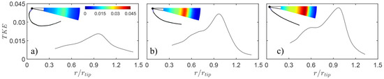 Similarly, in-plane turbulence kinetic energy in the vicinity of the plates showed particular features of the induced flow. Figure 8 illustrates that along the span of the thick plate for selected ; there, is promoted by the continuous shear layer across the plates. Interestingly, a local maximum near the plates occurs at . However, this is not the strongest signature in the spatially averaged field, which is located around the tip. Figure 8 also reveals a strong shear undergoing instability. The spatially averaged, dominant effect of the tip is revealed in Figure 9 for the three plates at selected rpm. Maximum level of are produced at with levels increasing with the stiffness of the plates for a given . It also reveals the secondary effect at .