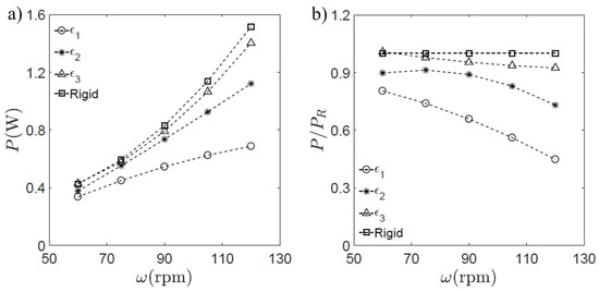 (a) Power consumption of the plate rotations across various and thicknesses; and (b) normalized power with respect to the rigid counterpart (reference).