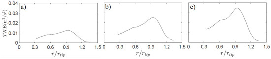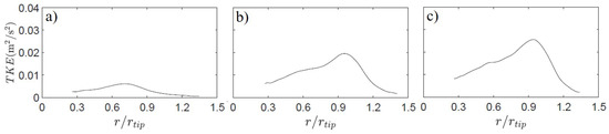 —averaged distributions of in-plane turbulence kinetic energy at = 0.75 mm for: (a) 60 rpm; (b) 90 rpm; and (c) 120 rpm.