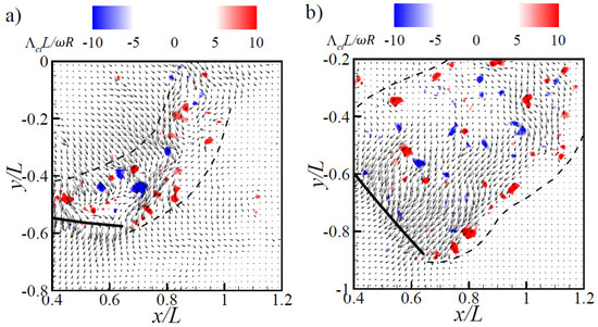 Instantaneous velocity fields superimposed with swirling strength (normalized by ) at 60 rpm around the: (a) thin plate; and (b) thick plate.