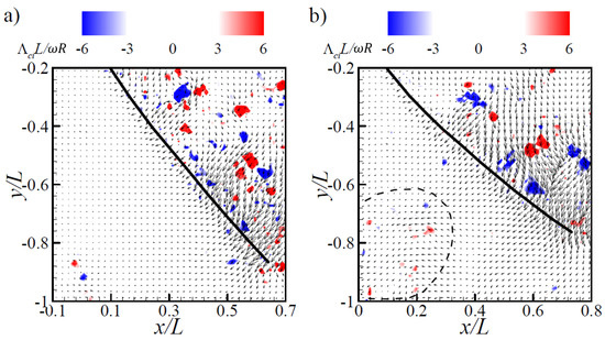 Snapshots of velocity fields with superimposed swirling strength (normalized by ) around the thick plate under: (a) 60 rpm; and (b) 90 rpm.