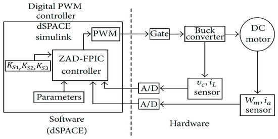 The speed of the motor is measured by using an encoder of 1000 pulses per revolution. The state variables, established as the output voltage , the inductor current , and armature current , are measured with an accurate resistance. The digital communication was performed by using a board with DS1104 of dSPACE, where the techniques of ZAD-FPIC are implemented. The output PWM is calculated by a DS1104 that sends the digital signal. The connection of the control system with the power system is performed with opto-couplers with fast response, such as HCPL-J312, which protect and isolate the digital circuit from possible currents and voltages generated in the power circuit. The state variables, , , and , reach the controller based on the input ADC of 12 bits. The controlled variable is measured by an encoder of 28 bits at sample frequencies of 6 kHz.