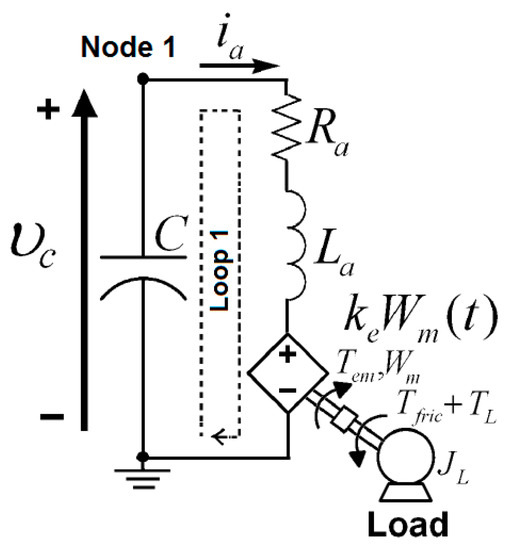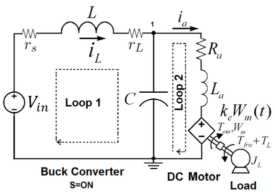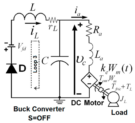 The buck-motor system can present a discontinuous conduction mode (DCM) when the switch is open and the currents in the inductor are zero. In this case, the diode stops conducting and the circuit can be represented as shown in Figure 5, with the differential equations shown in Equation (5). This last equation can be rewritten as .