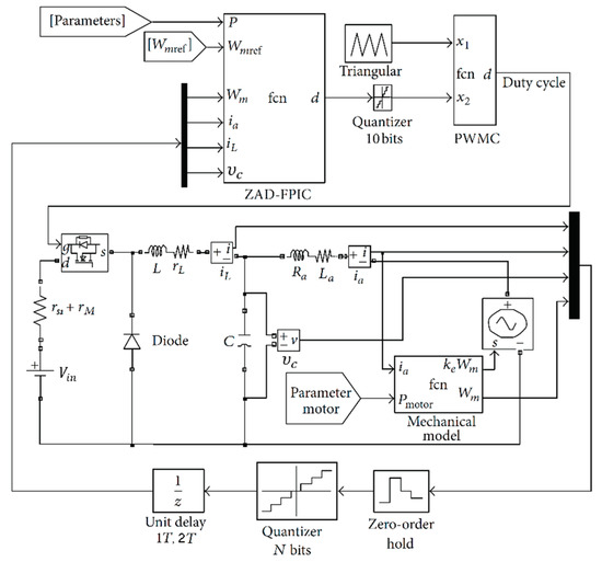 This section presents the results obtained from the dynamic analysis of a DC motor using a buck converter controlled by ZAD-FPIC. The quantization effects considered in the tests are: 28 bits of speed, 12 bits in the system variables (, , and ), and 10 bits for the duty cycle. MATLAB®/Simulink software was used for the simulation, and the simulation blocks that represent the system with ZAD-FPIC controller are shown in Figure 6. For the experimental test, the ZAD-FPIC technique is implemented in the rapid control prototyping card dSPACE DS1104; in this case, the card is programmed with MATLAB®/Simulink and then downloaded to the DSP. This platform has a graphical display interface called ControlDesk. In order to overlap the numerical with the experimental results, the experimental data were stored in matrices using the ControlDesk program and then read to perform calculations in MATLAB. Finally, the simulation is run and both the numerical and experimental results plotted.