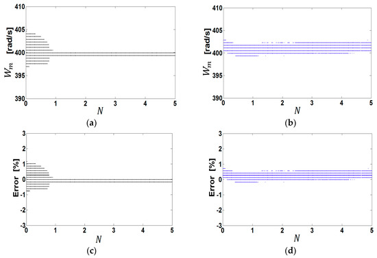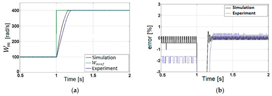 Figure 7 shows the dynamic behavior of the mechanical speed and the error of the signals when the electric circuit works in closed loops. The speed is determined for both simulation and experimental tests following a change in the reference signal . Figure 7a,b show the mechanical speed and the error over time, respectively, when the circuit works in a closed loop. In this case, the system is working in a closed loop when the reference signal is = 400 rad/s at t = 1 s, = 2, = 2, = 30, and = 1 with one delay period.