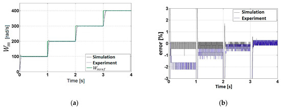 Figure 8 shows the behavior of the system working closed loops for the simulation and experimental test when the reference signal changes from 100 to 400 rad/s in intervals of 4 s. In the experimental test, the closed-loop system did not present an impulse, whereas for the simulation test, some small impulses are presented for the closed-loop system. The signals () present a settling time of ts ≅ 0.15 s. The steady-state error for the closed-loop system is less than 2%. There is a high coincidence between the numerical and experimental results. From the results shown in Figure 8a,b, the ZAD-FPIC controller is robust to the variations created in the reference signal.