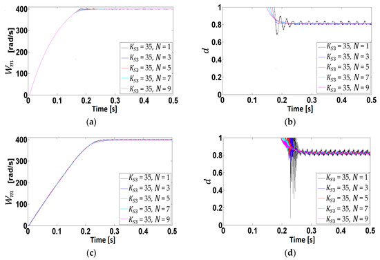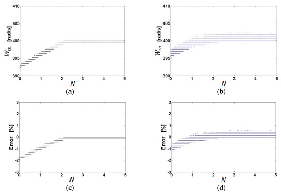 Table 5 and Table 6 summarize the results shown in Figure 9. Both the simulation and experimental test show that the steady-state error is less than 1% for the different values of the parameter . If the value of is increased or decreased, then it does not greatly affect the dynamics in the transient state. However, for small values of N, some small oscillations are presented and they will increase in amplitude if N is reduced below 1.