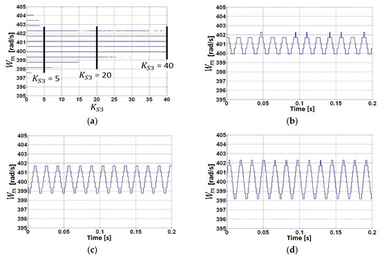 Figure 9 shows the behavior of the buck-motor system controlled by ZAD-FPIC. In this case, the control parameter is fixed as = 35, the reference signal is defined as = 400 rad/s, and some variations are made through the control parameter in values 1, 3, 5, 7, and 9.