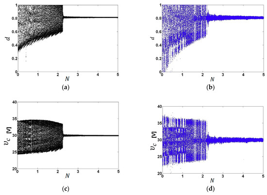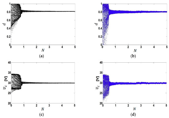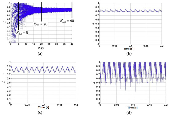 Figure 10a and Figure 11a show the bifurcation parameters of and d for the experimental test when the parameter is changed. Figure 10b–d and Figure 11b–d show the behavior of and d over time for the experimental test for , , and , when the values of , and = 1. The results show that for the value of , some 4T periodic orbits are presented, which is the behavior clearly represented in Figure 10b. For the value of , Figure 10a shows 6T periodic orbits, which can be represented in Figure 10c. For the value of , Figure 10a shows 8T periodic orbits, which is easily represented as Figure 10d. For the duty cycle d in both diagrams, some chaotic and quasi-periodic behaviors are presented for different values of as shown in Figure 11.