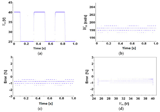 Figure 16 shows the behavior of the buck-motor system described in Figure 2 and with the parameters of Table 3. Figure 16a shows the behavior of the system when instantaneous perturbations are created in as performed for the experimental test. Figure 16b shows the effect in the regulated signal by changing and maintaining a value of = 198 rad/s and reference signal = 200 rad/s. Figure 16c shows that the regulation error was maintained at the value of −1%. Figure 16d shows a phase diagram between the regulation error and in which it is observed that the error was maintained at the value of −1%.