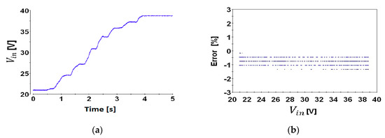 Figure 17 and Figure 18 show the behavior of the regulation error in the experimental test when was disturbed irregularly. In the first test, was increased as shown in Figure 17a, and for this input, Figure 17b presents the results of the error vs. , where the ZAD-FPIC controls the output signal with an error lower than −2%. For the second test, was initially increased and then further decreased as shown in Figure 18a, and the error of the control variable vs. does not exceed −2% as shown in Figure 18b.