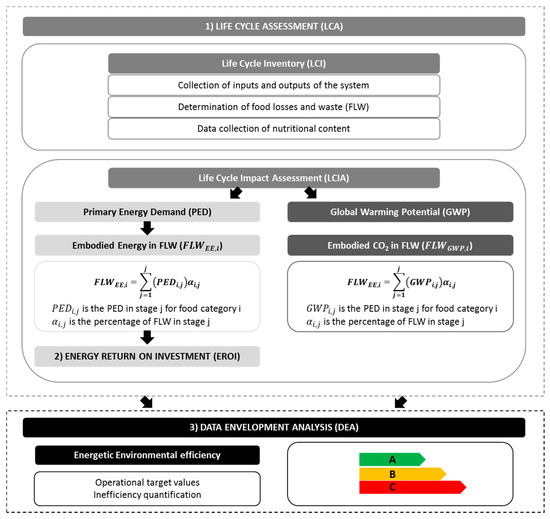 Figure 1 depicts the methodology described in this analysis, which attempted to assess the energy and environmental efficiency of Spanish agri-food system using a life-cycle approach. Firstly, an LCA was conducted to estimate the primary energy demand (PED) and related global warming potential (GWP). Secondly, the EROI was estimated to describe the energy efficiency of food categories under study. Finally, DEA was synergistically combined with LCA results to assess the efficiency of the system.