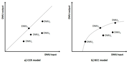 Charnes, Cooper, and Rhodes (CCR) introduced the DEA method for the first time. The original CCR model was applicable to the assumption of constant returns to scale (CRS) [57]. In this sense, the CCR model considers that the efficiency frontier is a straight line intersecting the point of origin and the best performer(s), as shown in Figure 2a. The best performer is determined by the highest ratio of output to input; thus, as DMU2 has this condition, it is considered as the reference DMU for all other units [38]. The remaining four DMUs in Figure 2a are inefficient since they use more amounts of input than DMU P2 to produce one unit of output.