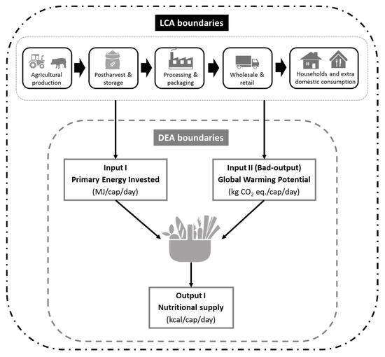System boundaries for the Spanish food basket using a life-cycle assessment (LCA)/data envelopment analysis (DEA) approach.