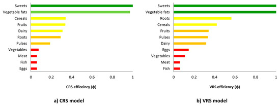 Efficiency (φ) score of the selected food categories (i.e., decision-making units (DMUs)) using the (a) constant return to scale (CRS) model, and (b) variable return to scale (VRS) model.