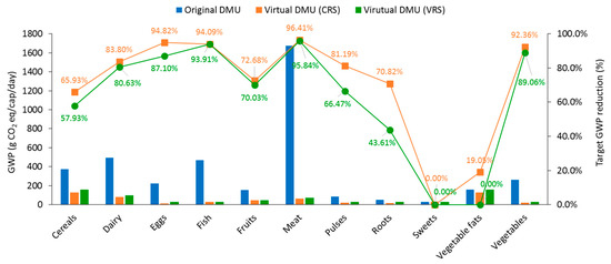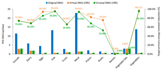 Figure 6 and Figure 7 compare the current environmental impacts of the different DMUs with the target PED and GWP calculated with the LCA/DEA methodology. In other words, it presents the environmental savings that would be reached in these DMUs if they were to operate under the efficient conditions projected in the computed matrix. In this regard, when the CRS perspective was used, primary energy invested savings ranged from 2.83% to 96.7%, while, when the VRS approach was used, reductions ranged from 52.9% to 95.3%. The highest reductions were obtained by the most inefficient food categories (i.e., vegetables, meat, fish, and eggs). On the other hand, GWP savings followed the same trend, ranging from 19% to 96.4% for CRS and from 43.6% to 95.8% for VRS. Similarly, the highest reductions were also reached by vegetables, meat, fish, and eggs.