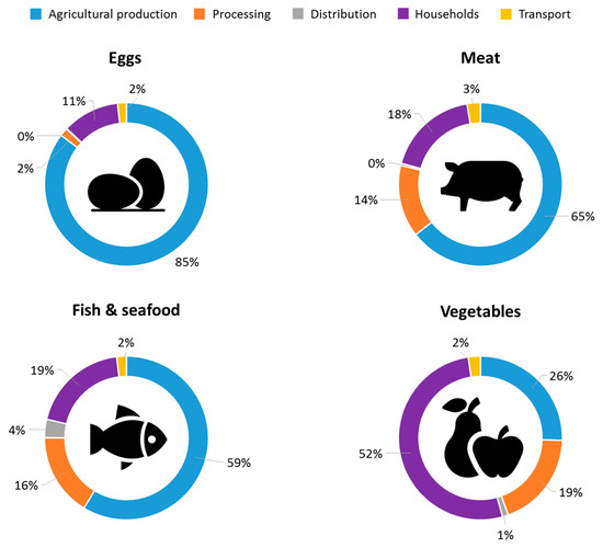 The results suggest that the planification of citizens’ diet may affect the quantity of embodied energy waste and related environmental impacts. For this reason, specific strategies should be addressed to the categories revealing larger inefficiency scores, such as meat, eggs, fish, and vegetables, which all have better nutritional reputation than sweets or processed cereals. Figure 8 displays the contribution of each stage of the FSC to the PED for eggs, meat, fish and seafood, and vegetable categories. As stated by Batlle-Bayer et al. [64], in terms of the life-cycle processes, the primary production phases were the major contributors to the PED for eggs (85%), meat (65%), and fish and seafood (59%), while the household stage was the main contributor for vegetables (52%). These results are related to the production of feed in the case of eggs and meat production [60]. According to Ghasempour and Ahmadi [79], the production of feed (corn, soybean, and wheat), as well as the poultry equipment, used in the production of eggs is associated wuth the most energy consumption, whereas Skunca et al. [17] suggested the use of grain legumes as a protein source in feed instead of soybean-based ingredients. This fact could decrease the resource consumption since the cultivation of grain legumes does not require mineral fertilizer application. Moreover, in the case of beef, the use of electricity and diesel during the suckling cow–calf stage was also significant in the primary production phase [64].