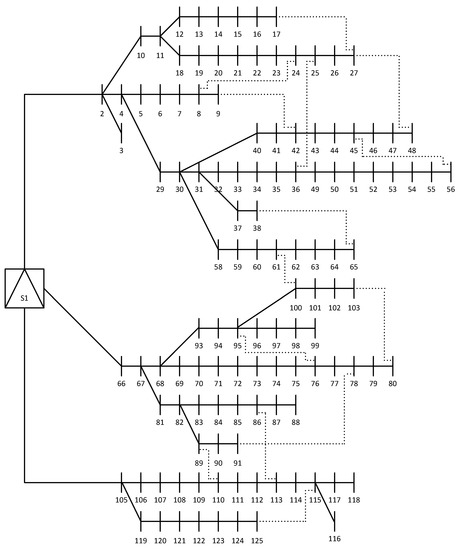 Most of the traditional distribution networks are meshed by design, but they are operated radially only due to technical limitations that are mainly related to system protection. These limitations are discussed in [13]. This means that some tie-lines (also known as switches) are kept open so that the grid’s topology remains radial. Thus far, it has been easier to operate and protect a radial topology [13,14,15,16].