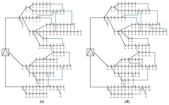 A total of six case studies are considered, designated as Case A to Case F. Case A is the Base Case, which neither considers network reconfiguration nor meshed operation. In Case B, network reconfiguration is allowed but always while maintaining a radial topology. Cases C to F all consider a meshed operational scheme, but with different levels of meshing (30% in Case C, 60% in case D, 80% in Case E, and 100% in Case F). The network configurations for the last four cases are presented in Figure 2. Note that meshing the distribution network makes use of existing tie-lines. For Cases B to F, the upper and lower voltage boundaries have been enforced. Table 6 shows the total expected cost, along with a breakdown of this cost and the total expected power losses in the system.
