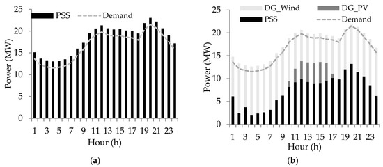 Energy mixes in the (a) Base Case and (b) Case B. PSS: Power from Substation; DG: distributed generation.