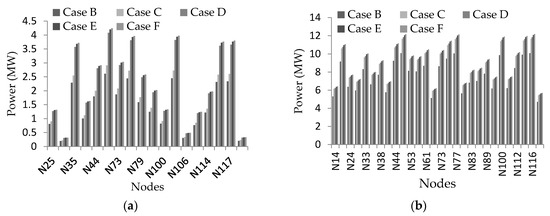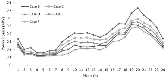 With regard to energy losses, the average profile of active power losses during the considered 24-h period of each case is shown in Figure 5. The results are in accordance with Table 6, dropping from Case B to Case F, as has already been mentioned before. In Cases C to F, losses decrease within an interval, since, in addition to the DGs being near the loads, there are also now in some sections of the network smaller paths to be “traveled”, resulting in a losses decrease.