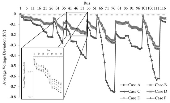 Figure 6 shows the average voltage profile corresponding to each case. The voltage deviation profile in Case A is the only one in which the deviations in some nodes surpasses the lower bound. In the remaining cases, where DGs are already integrated, all voltage deviations are significantly improved, and largely remain within the permissible range. In Case B as well as in the cases that involve network meshing (i.e., Cases C through F), voltage deviations do not show significant differences. In the figure, detailed voltage deviations for the nodes from 41 to 53 can be seen in the section that is zoomed out. In this particular section, we can see minor improvements in the voltage deviation, especially from Cases C through F. Generally, the case that has the most meshed network (i.e., Case F) has the best voltage deviation portfolio among the cases.