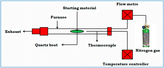 A survey of previous literature reveals that different types of precursors, including but not limited to coconut shell [20], walnut shell, almond shell, olive stone, almond tree pruning, [21] and orange peel, mung bean husk, hemp, date palm tree, saw dust, etc., have been experimented on as the source materials towards the fabrication of AC [22]. Chemical or physical activation of the precursors using different types of chemicals, including phosphoric acid, zinc chloride, sodium hydroxide, potassium carbonate, and potassium hydroxide, has been reported [16,23,24,25,26,27]. The decomposition of the complex molecules of the starting materials by heat (in other words pyrolysis) is usually performed in a furnace at a particular temperature under inert atmosphere.