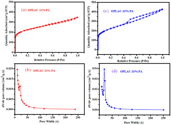 (a,c) The nitrogen adsorption–desorption isotherms, at 77 K, of OPLAC-11% PA and OPLAC-33% PA, respectively; and (b,d) represents their corresponding pore size distributions. “OPLAC: Oil Palm Leaf-derived Activated Carbon; PA: Phosphoric Acid”.