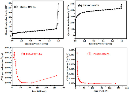 (a,b) The nitrogen adsorption–desorption isotherms, at 77 K, of PKSAC-11% PA and PKSAC-33% PA, respectively; and (c,d) represents their corresponding pore size distributions. “PKSAC: Palm Kernel Shell-derived Activated Carbon; PA: Phosphoric Acid”.