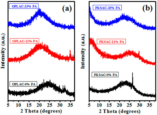 X-ray diffraction pattern of: (a) As-prepared activated carbon, synthesized from OPL-derived feedstock at various chemical concentrations (weight %); and (b) PKS-derived AC, prepared under the same conditions as in (a).
