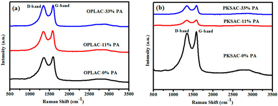 The Raman spectra of: (a) OPL-derived activated carbon (AC); and (b) PKS-derived activated carbon (prepared using different concentrations of H3PO4), showing D- and G-bands.
