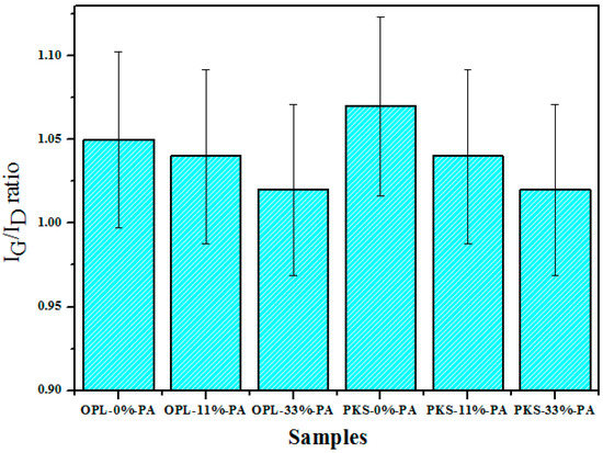 Plot of the ratio of the intensity of the Raman G and D peaks IG/ID of the as-prepared OPL- and PKS-derived activated carbons, produced at various concentrations of the activating reagent. (n = 3)