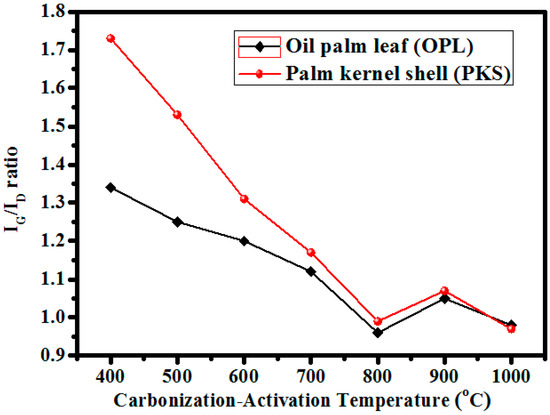 In summary, from the initial temperature investigation conducted on the precursors (Figure 7), it can be deduced that the graphitization formation of the two materials (though different slopes were exhibited) were all influenced or decided on by temperature, which linearly extend up to 800 °C. The excellent convergence of the ratios observed at 900 °C indicates a clear resemblance between the two precursors at an elevated temperature, when all the non-carbon components are eliminated. In addition, this also connotes the optimum graphitic nature formation of the materials. Thus, this temperature (900 °C) was adopted as the working temperature to activate the precursors after being chemically impregnated with phosphoric acid.