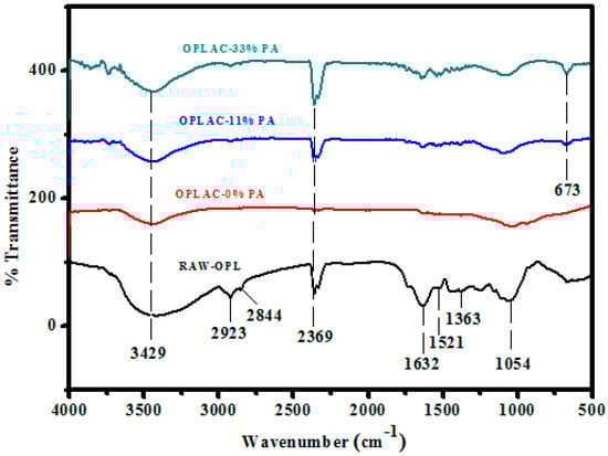 General assessment of all the spectra revealed that the raw samples had a greater number of transmittance peaks in the fingerprint region (1600–650 cm−1). This could imply the existence of more chemical functional groups in the raw samples, in contrast to their resultant activated carbon [50]. The dominant chemical functional groups contained in the raw OPL and PKS powders were primary aliphatic alcohol ν(O–H) 3429 cm−1 and 1054 cm−1, ester ν(C=O) 1632 cm−1, and aliphatic hydrocarbons ν(C–H) for –CH3 2923 cm−1, O–CH3 2844 cm−1, and gem-dimethyl 1363 cm−1.