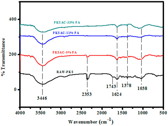 The sharp peak observed at 26.9° on PKSAC-0% PA suggest the presence of crystalline inorganic compounds that may be attributed to the trace elements within the palm kernel shell precursor [36,37]. This peak disappears after impregnation with phosphoric acid (PA) and subsequent carbonization-activation at 900 °C due to the waning of the trace elements.