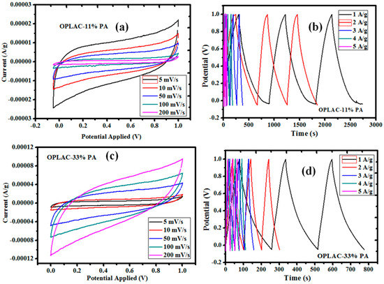 Cyclic voltammogram (CV) and galvanostatic charge and discharge (GCD) curves of the as-fabricated activated carbon obtained from oil palm leaf-derived precursors. (a) Represents the CV curves of the OPLAC-11% PA, measured at different scan rates; (b) represents the GCD profile of OPLAC-11% PA, measured at different current densities; (c) CV curves of the OPLAC-33% PA, measured at different scan rates; (d) GCD profile of OPLAC-33% PA, measured at different current densities.