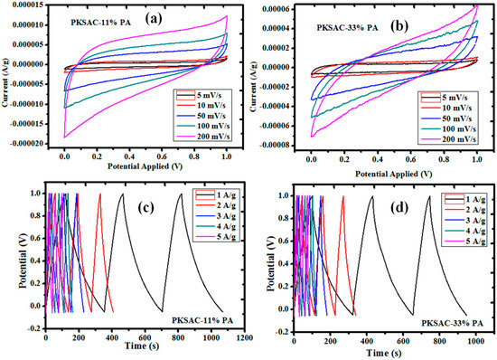 Cyclic voltammogram (CV) and galvanostatic charge and discharge (GCD) curves of the as-fabricated activated carbon obtained from palm kernel shell-derived precursors. (a) and (b) represents the CV curves of the PKSAC-11% PA and PKSAC-33% PA, respectively, measured at different scan rates; While (c) and (d) represents the GCD profiles of PKSAC-11% PA and PKSAC-33% PA, respectively, measured at different current densities.