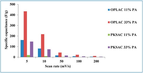 The cyclic voltammogram (CV), acquired between 0.1 and 1 V potential range at different scan rates, and the GCD profiles are presented in Figure 10 and Figure 11, respectively. For these supercapacitors, rectangular-shaped cyclic voltammograms (with good capacitor-like characteristics) were successfully achieved. Fascinatingly, this trend is what is generally needed for useful applications relating to high energy and power density [51]. To determine the specific capacitance, the areas under the curves were integrated. Thus, the highest value achieved was discovered to be 434 F g−1 at 5 mV s−1 and tended to reduce with an increasing scan rate (Figure 12). This result (finding) is considerably higher than those established for porous carbon nanoparticles (PCNs) produced by single-step pyrolysis of oil palm leaves under a nitrogen atmosphere [12] (Table 2). It is understood that the adequate time taken for the electrolyte ions (at a lower scan rate) to diffuse into the micropores of the OPLAC-33%-PA sample is ascribed to the immense increase in the specific capacitance values of this sample (Figure 12). At a higher scan rate, on the other hand, the electrolyte ions may not have such ample time to disseminate into the micropores, and this could be attributed to an extremely slow increase in the specific capacitance value [12] (Figure 12).