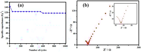 The cycling performance of the EDLC based on the OPLAC33%-PA electrode was also evaluated and is presented in Figure 13a. It is graspable that about 82% (118 F/g) of the initial specific capacitance was maintained, even after 1000 cycles, which implied that the OPLAC33%-PA had a good stability in the three-electrode system.